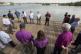 A delegation of United Methodist and other church leaders prays together on the U.S. shore of the Rio Grande at Anzalduas Park in Mission, Texas, directly across the border from Reynosa, Mexico. The group is holding a strategy meeting to learn more about the border crisis and improve the United Methodist response. Photo by Mike DuBose, UMNS.