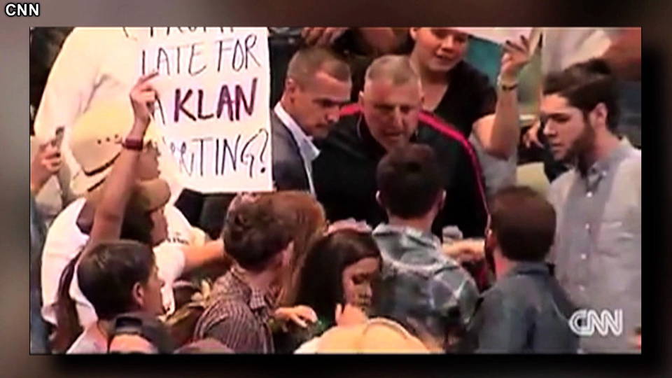 Donald Trump: "Well, you know what? Because the security at the arena, the police were a little bit lax, and he had signs—they had signs up in that area that were horrendous, that I cannot say what they said on the sign, but the ultimate word. And it was all over the camera. And frankly, the television cameras can’t take it, and they can’t do anything about it. And I will give him credit, spirit. Now, he didn’t touch. He wasn’t pulling that man. That was somebody else."