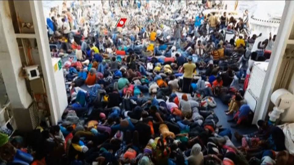 The Italian coast guard says it rescued a staggering 11,000 refugees trying to make the deadly crossing from Libya into Europe this week alone, amid the greatest refugee crisis since World War II. The coast guard says at least 50 people died in the crossing, including 20 people who reportedly suffocated in the hold of a boat. An aid worker has compared the conditions in the cargo holds of the overcrowded fishing boats used to transport refugees to those of slave ships. This is the deputy mayor of the Italian coastal town of Pozzallo.