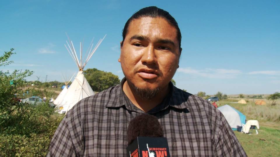 In North Dakota, land defenders opposing the $3.8 billion Dakota Access pipeline are facing increasing repression. On Thursday, Morton County Sheriff Kyle Kirchmeier announced he may call on law enforcement agencies from outside North Dakota to come assist North Dakota deputies, saying, "We have basically tapped the resources to a level that we’ve never seen here in North Dakota for one particular incident." The announcement came as land defenders again shut down construction at multiple construction sites Thursday. In recent weeks, police have begun deploying military-grade equipment, including armored personnel carriers and surveillance helicopters. Meanwhile, the first person to lock himself to active Dakota Access pipeline construction equipment is now facing felony charges, after his misdemeanor case was dismissed and then refiled as a felony case. Dale "Happi" American Horse locked himself to an excavator on August 31, stopping construction for hours. Democracy Now! spoke to him a few days later, on September 3, as we visited the Sacred Stone encampment in North Dakota.